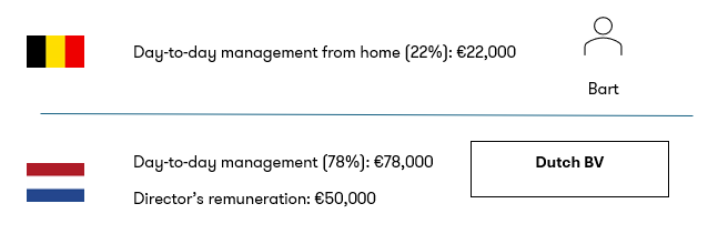 Bart lives in Belgium and has been appointed as director under the articles of association of a Dutch BV. He receives a director’s remuneration of €50,000. In addition, he receives a salary of €100,000 for day-to-day management activities; he performs 22% of these day-to-day management activities in Belgium.