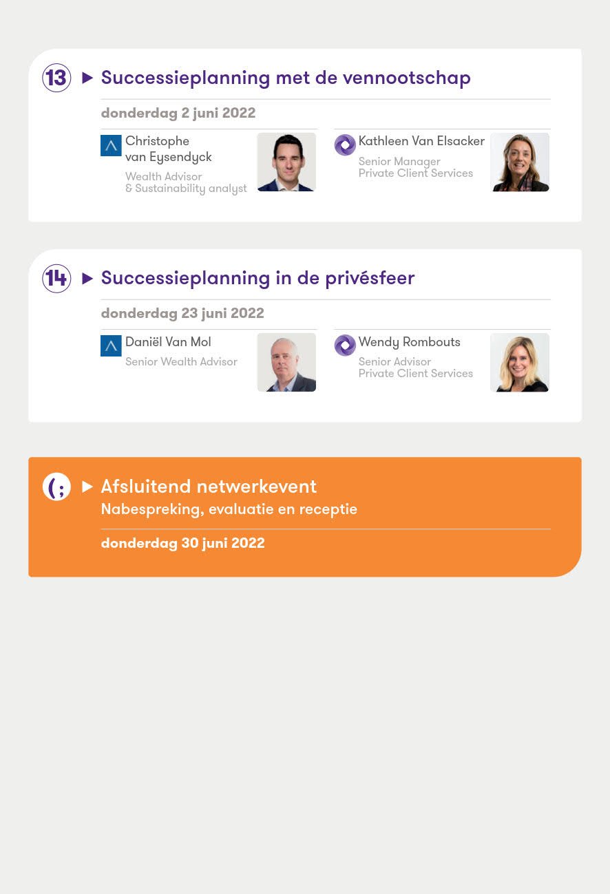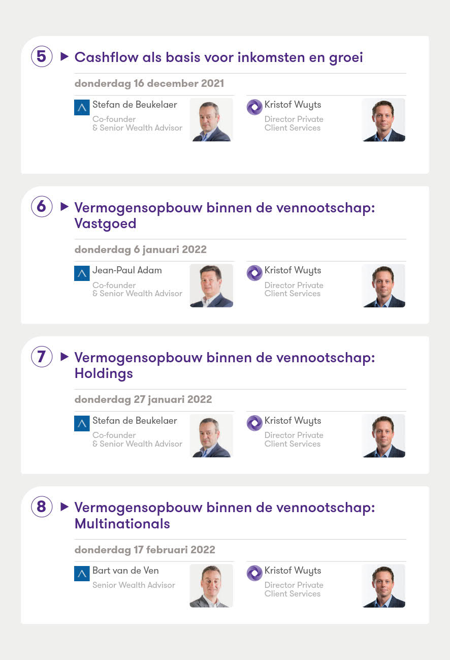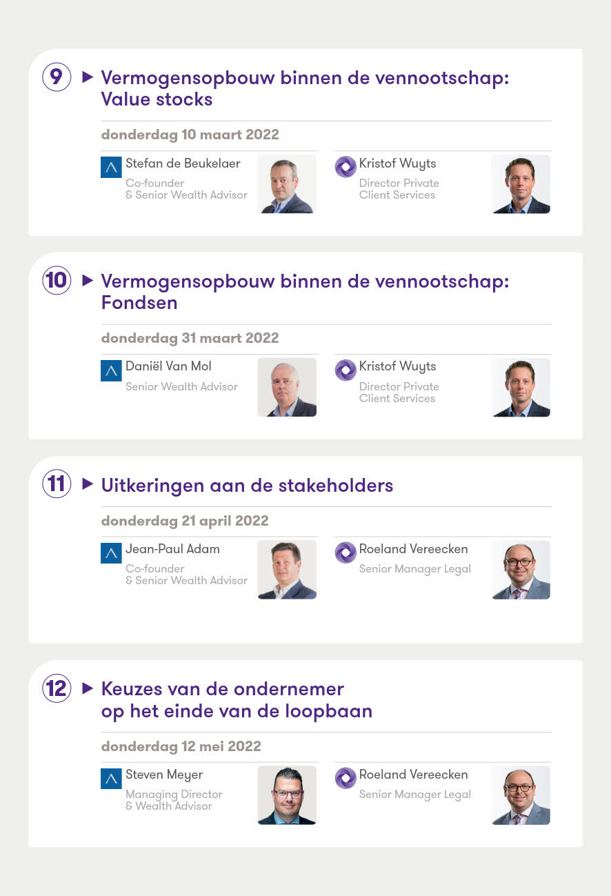 In een reeks van 14 korte webinars belichten de multidisciplinaire experts welke mogelijkheden u als ondernemer heeft, en wat de praktische, juridische en fiscale gevolgen zijn. De pragmatische insteek van onze sessies stelt u in staat op het einde van het traject de juiste keuzes te maken voor uw vennootschap en ze vervolgens te implementeren.