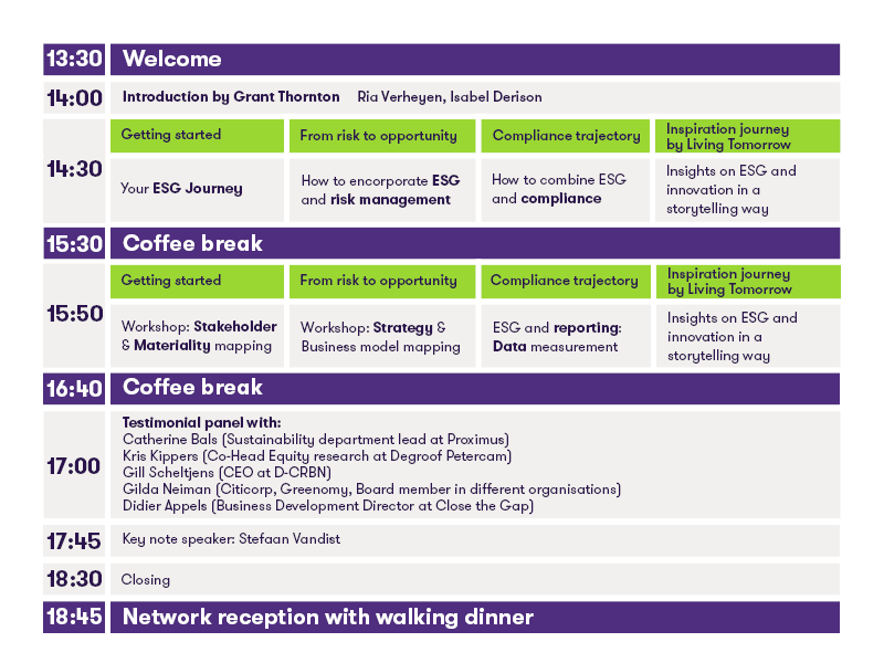 During the whole afternoon we will take you on an ESG journey with interactive workshops, interesting content and captivating panel discussions, moderated by Francesca Vanthielen.