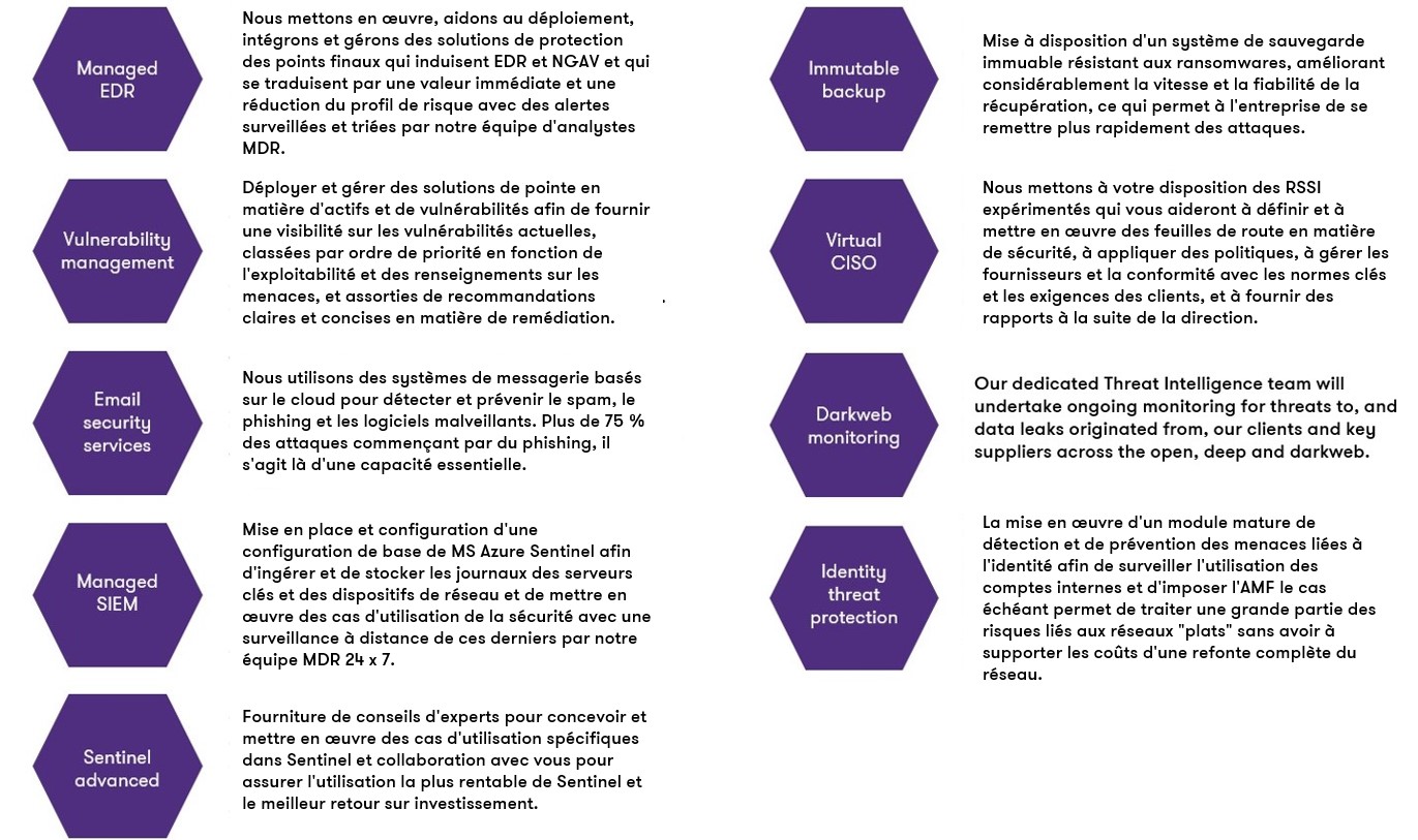 Grant Thornton MDR propose un package complet de services de gestion de la protection qui combine une série de possibilités. Il vous aide à vous concentrer sur certaines questions critiques en réduisant le nombre de faux positifs, en automatisant le tri et en priorisant les risques qui orienteront vos décisions et l’affectation des budgets.