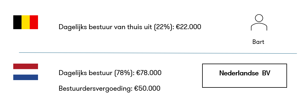 Bart woont in België en is benoemd als statutair bestuurder bij een Nederlandse BV. Hij ontvangt een bestuurdersvergoeding van €50.000. Daarnaast ontvangt hij een vergoeding voor dagelijks bestuur/directiewerkzaamheden van €100.000: 22% van zijn prestaties voor het dagelijks bestuur voert hij uit in België.